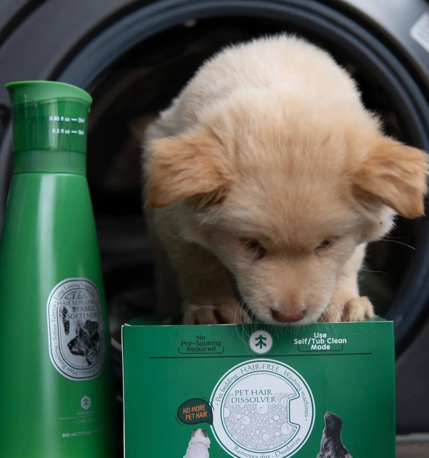 - Pre-treat fabric with the 3-in-1 Spray to remove surface hair, then wash with Hair Dissolver + Laundry Powder.